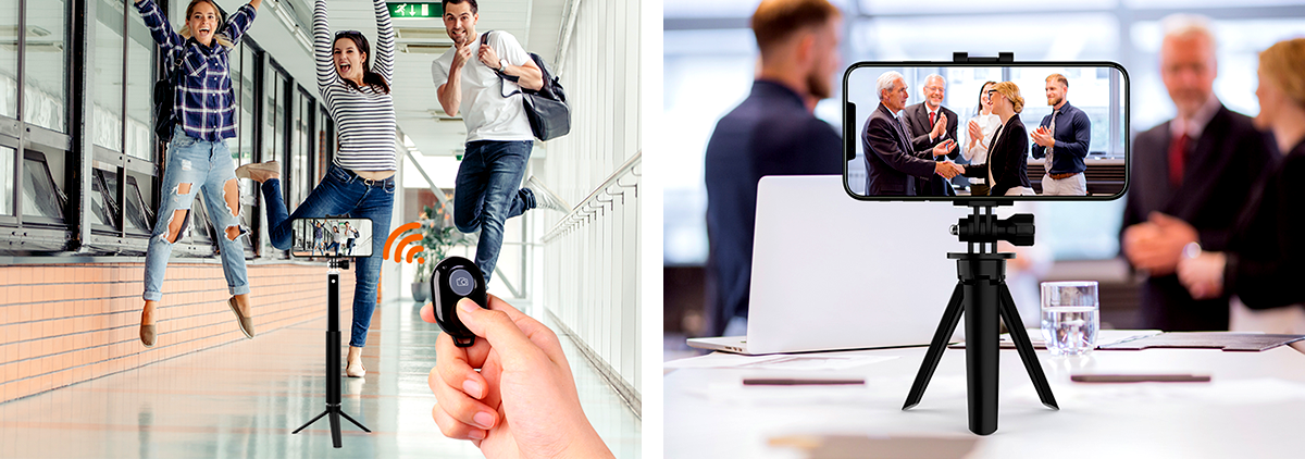 Aksiyon kameranız ve cep telefonu'nuz ile yapacağınız tüm kayıt işlemlerinde Monopod veya Tripod olarak kullanılabilir, Çok yönlü kamera tutucu ve uzatılabilir uzaktan kumandalı selfi çubuğu.